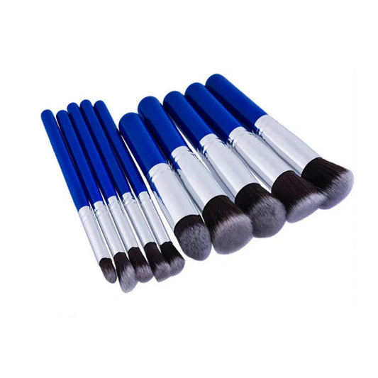 10-piece blue and silver makeup brush set with nylon bristles and wooden handles measuring 15.5cm and 12cm lengths for precise foundation application and portable storage in an OPP brush bag
