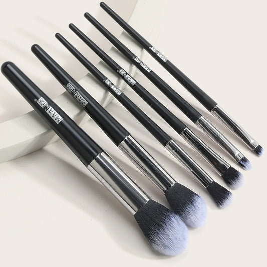 6-piece makeup brush set with synthetic fibre bristles offering precise powder application and natural wood handles measuring 15cm for comfortable grip during professional or home use