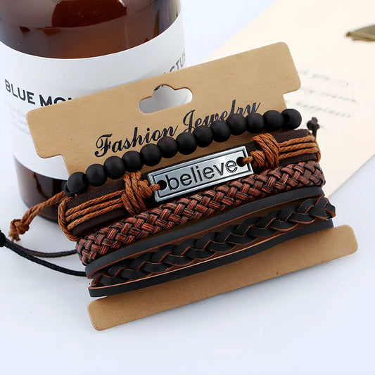 Believe Suit Men's Brown Leather Bracelet with Geometric Design
