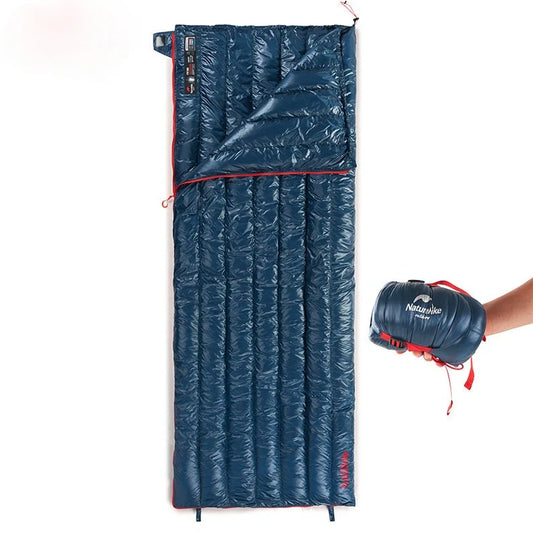 Camping sleeping bag with 90% white duck down filling and waterproof 15D 410T nylon fabric, offering warmth retention in temperatures down to -5°C with a compressible design reducing packed size by 60%