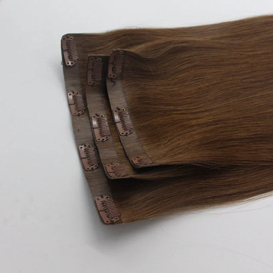 Clip-in human hair extensions in 10 length options from 10 to 30 inches, made from 100% real hair that can be dyed and styled with heat tools for custom colour and texture