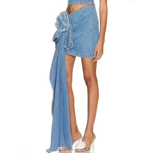 Shopfluxpro NZ Stylish High-Waist Blue Denim Skirt with Unique 3D Rose Detail