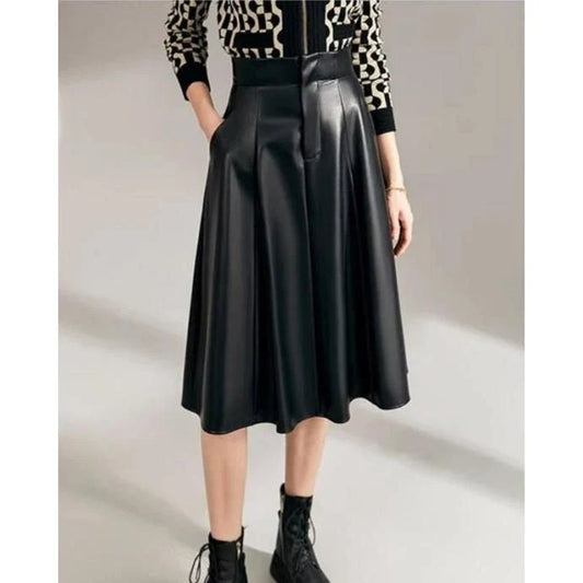 Shopfluxpro NZ Stylish High Waist A-Line Knee-Length Black PU Leather Skirt