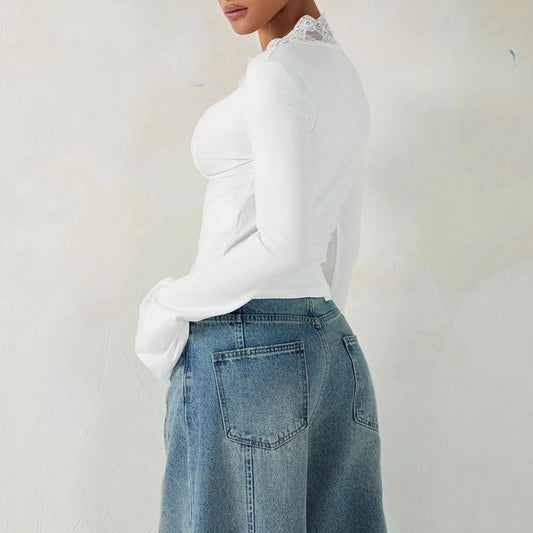 shopfluxpro.com Slim V-neck Lace T-Shirt with Trumpet Sleeves for Women