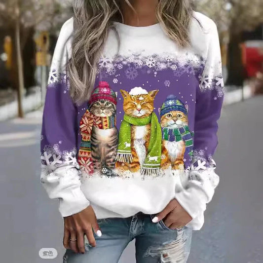 shopfluxpro.com Women's Christmas Snowman and Cat Print Long Sleeve T-shirt in Loose Fit
