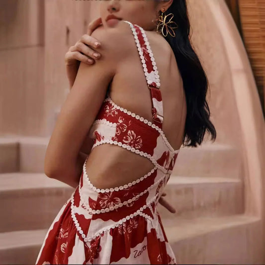 shopfluxpro.com Women's Red Flower Print Lace Sling Dress with V-neck Design