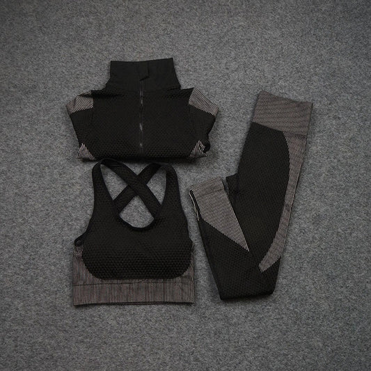 Three-piece stretch fitness pants sports yoga suit with nylon fabric providing 4-way stretch for unrestricted movement during workouts, available in S/M/L/XL sizes and multiple colour options including pink, malachite green, and black and white