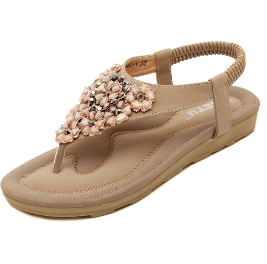 Women's Flat Sandals with Rhinestone Flowers and Elastic Ankle Strap