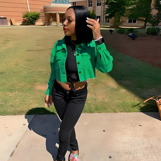 Women's Cropped Denim Jacket with Long Sleeves and Lapel Collar