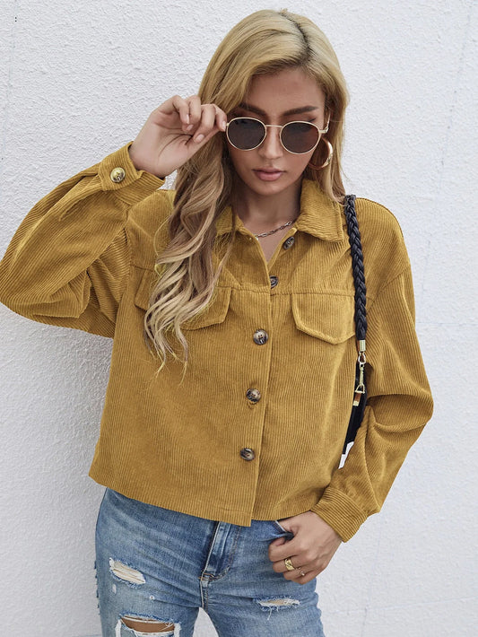 Women's corduroy short slim coat with 100% polyester construction, available in six colours including wine red and apricot, featuring long sleeves and street hipster styling for everyday wear